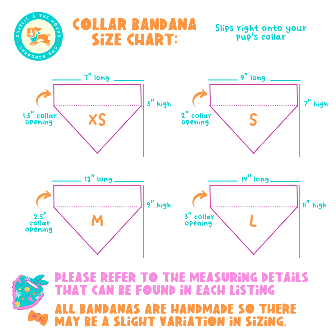 Collar bandanas slip right onto your pups existing collar, so no more fear of it falling off while playing! The best part is they’re reversible giving you two bandanas in one. Each bandana is handmade with 100% cotton and top stitched around the edges for added durability.